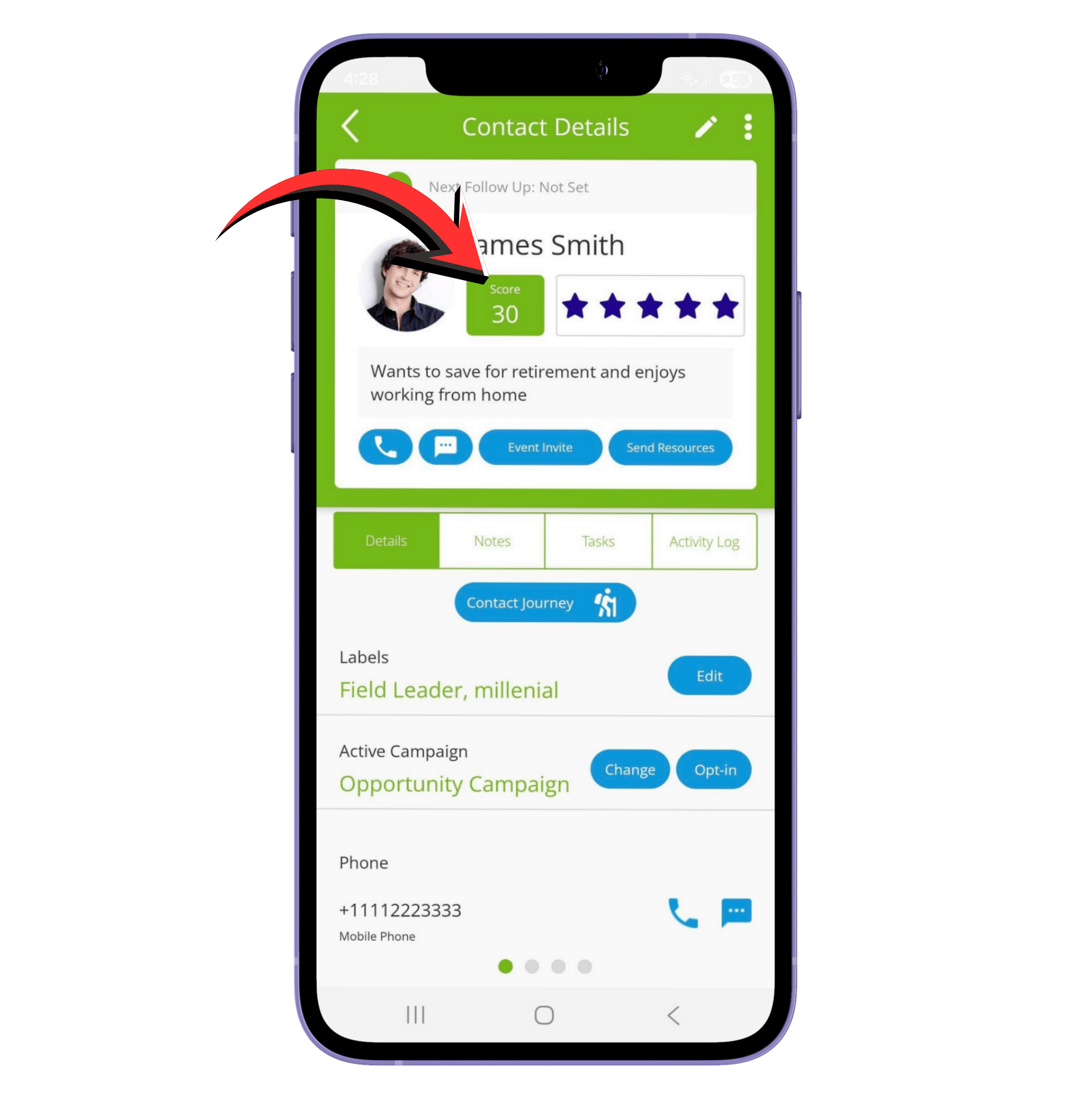 A contact score measures how engaged someone is with the resources, campaigns, and event invites you’ve sent. Higher scores mean the contact is more active, responsive, or interested. Scores are calculated automatically based on their actions and video views, and can also be manually adjusted using star ratings.