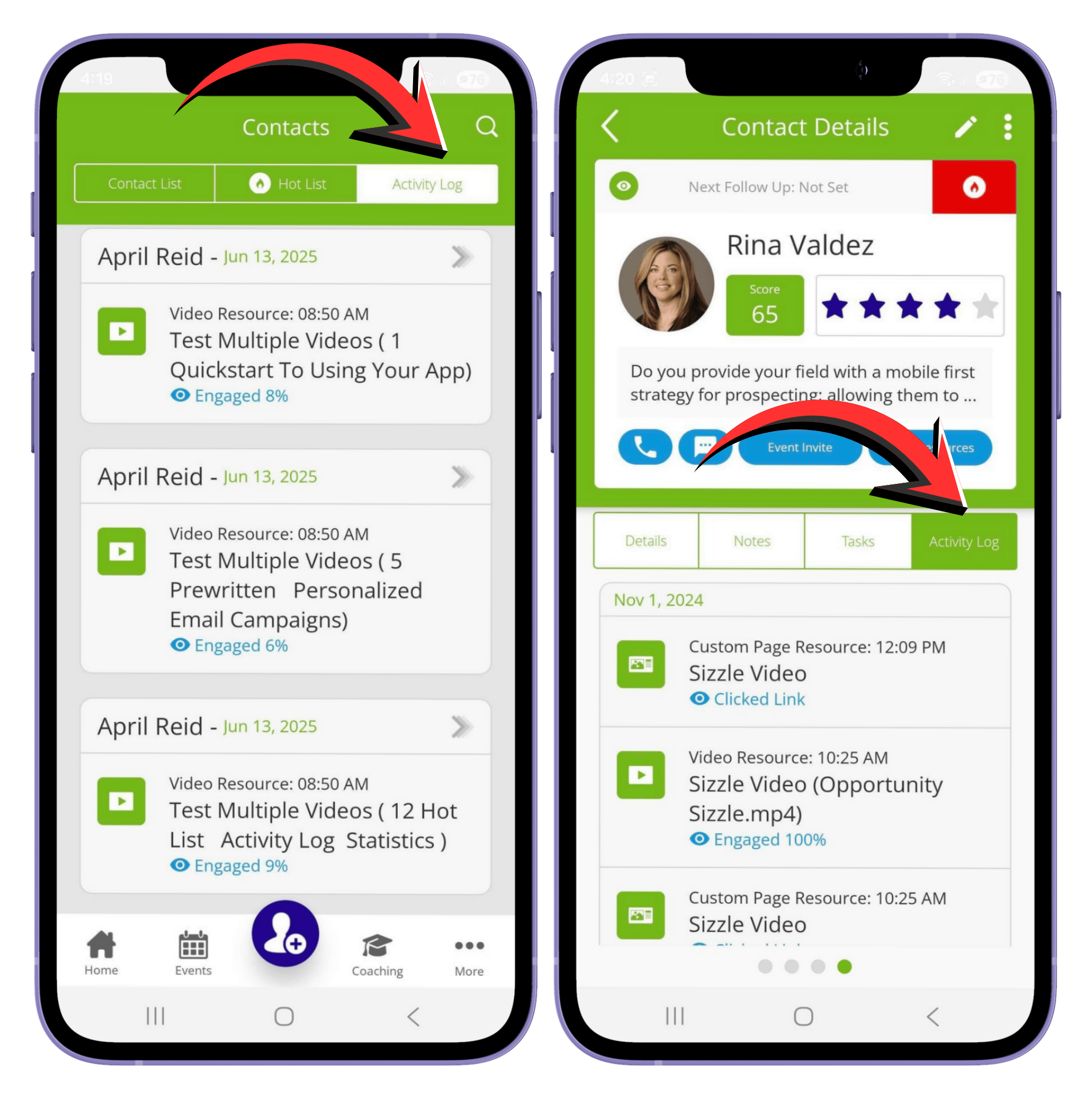 - On the mobile app: go to Contacts → tap the Activity Log column on the Contacts page.